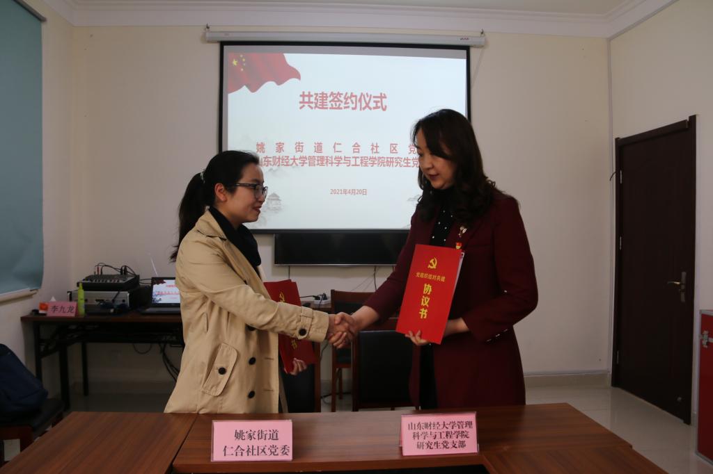 2021年4月20日下午,公司党委与济南市历下区姚家街道仁合社区党委举行党建工作结对协议签订仪式。此次签约以研究生党支部为主对接社区党委,公司党委副书记崔东峰、团委书记、研究生党支部书记何丽,社区党委负责人石磊、社区部分专职工作人员和公司研究生党员代表参加了签订仪式。