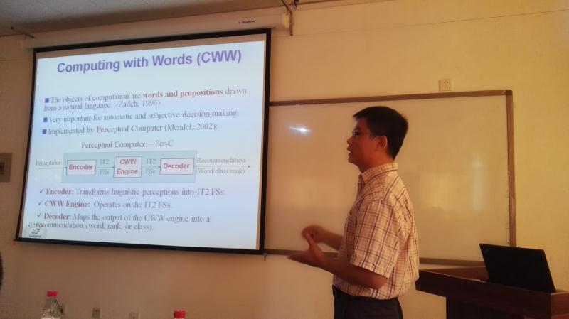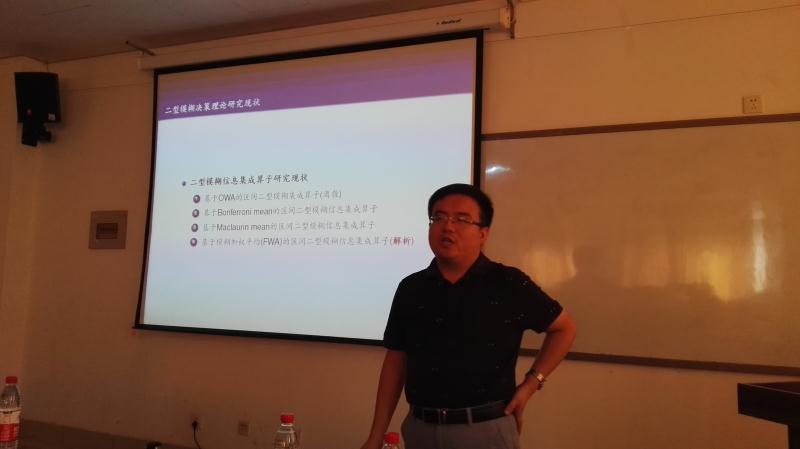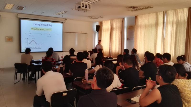 作为计算智能领域国际知名的青年学者,伍教授在二型模糊、感知计算等领域做出了开创性的研究成果。伍教授的报告深入浅出,高屋建瓴,系统地为师生们讲述了二型模糊集合的基本概念、感知计算的框架,并分模块由简入难详细讲解了基于二型模糊集合的编码、解码、多属性决策和多目标决策情形下的词计算引擎的具体工作步骤。秦晋栋副教授是二型模糊决策领域国内知名的青年学者。秦教授首先从基于大数据的全景式决策理论这一研究热点引入二型模糊决策的问题,全面介绍了二型模糊决策的国内外研究现状,总结了他本人在二型模糊决策领域所做的研究工作,指出了未来一段时期内二型模糊决策的研究热点和方向。