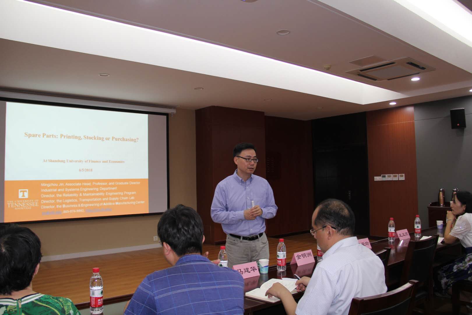 6月5日,美国田纳西大学工业与系统工程系主任金明洲教授应邀来公司为师生作了题为“Spare Parts: Printing, Stocking or Purchasing?”的学术报告。报告由学院经理助理马建华主持,部分教师和研究生共40余人参加此次报告会。