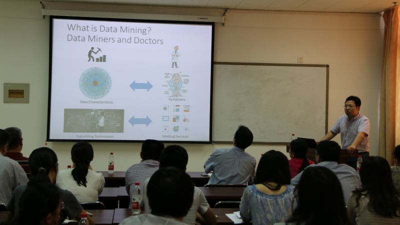 肖可砾博士具有工科和金融学的学位,对数据挖掘和金融理论有深厚的学术功底,所做研究已经做到跨学科的深度融合。在一个半小时的报告中,肖博士先是简单介绍了数据挖掘技术以及大数据分析在金融商业领域和学术研究领域的重要影响,然后分享了自己的最新成果:微博中股票关注度对股票异常回报影响的研究以及基于神经元网络和大数据结合对股票价格走势的预测研究。肖博士的报告引起了在场研究生和老师们的极大兴趣,纷纷踊跃提问。