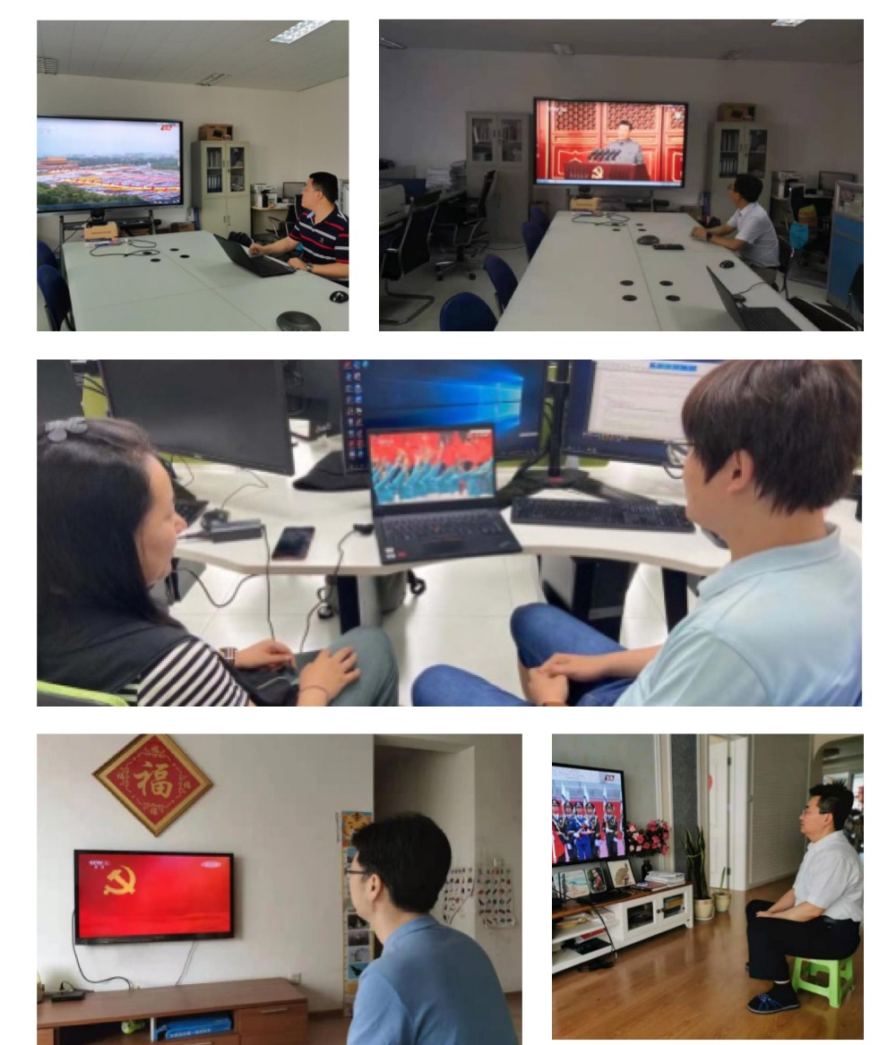 “我代表党和人民庄严宣告,经过全党全国各族人民持续奋斗,我们实现了第一个百年奋斗目标,在中华大地上全面建成了小康社会,历史性地解决了绝对贫困问题,正在意气风发向着全面建成社会主义现代化强国的第二个百年奋斗目标迈进……”“我们积极学习借鉴人类文明的一切有益成果,欢迎一切有益的建议和善意的批评,但我们绝不接受‘教师爷’般颐指气使的说教!中国共产党和中国人民将在自己选择的道路上昂首阔步走下去,把中国发展进步的命运牢牢掌握在自己手中”“任何人都不要低估中国人民捍卫国家主权和领土完整的坚强决心、坚定意志、强大能力”随着习总书记铿锵的声音,燕山校区逸夫楼514、610、621会议室、圣井校区学院报告厅响起了阵阵掌声、欢呼声,这里是公司组织师生党员、入党积极分子、民主党派代表收看庆祝中国共产党成立一百周年大会盛况直播的现场。除了集体收看外,各支部也根据实际情况,组织了党员利用手机、电脑在教研室、实验室等不同岗位收看了本次直播。