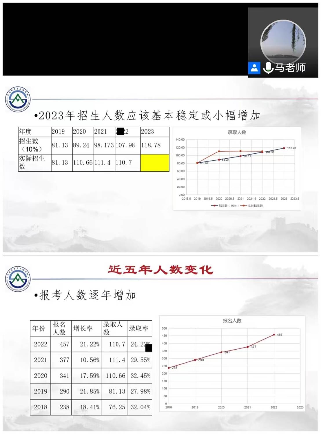 会上,马建华从全国报考情况、学院报考情况、学院招生情况、2023年趋势分析四个方面展开了详细地讲解。马建华从疫情等各方面原因分析了近五年研究生考试的情况,对比了学院报考率和全国研究生报考率,给出了2022年本科生考研录取人数以及考入院校,着重介绍了各个专业的招生计划和考试科目,同时从工学和管理学两个方面详细分析了2023年报考趋势。在互动环节中,同学们踊跃提出自己在考研方面的疑惑,马经理耐心地回答了每个同学的问题并给出针对性的建议,帮助同学们明确方向。