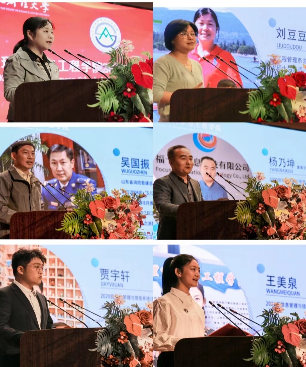教师代表、工程管理系主任刘豆豆为同学们描绘了一个属于每一个财大学子的青春底色,她教导同学们要朝着既定目标持之以恒地前进,成长为硕果累累、成熟自信的青春建设者,奔向辉煌灿烂的新征程。2020级在校生代表贾宇轩结合自身的大学经历勉励大家要敢梦敢闯,于平凡世界中创造不平凡的价值,以青春的热血和拼搏的汗水探索未知旅途,创造无限可能。员工代表、2000届信息管理与信息系统专业毕业生、现任济南福卡斯信息科技有限公司董事长的杨乃坤回望自己的大学经历,激励同学们努力找到人生目标,在大学中增长知识,付诸实践,丰富阅历,成为时代所需的复合型人才。2022级新生家长代表吴国振以自己的抗险救灾经历为例告诉同学们接受大学教育的重要性,指出要以学业为重,实现自我目标,担当社会责任。2022级管理科学与工程类的王美泉代表全体新生发言,她表示将会刻苦努力,不懈坚持,不负学院老师的关怀与家庭的期望,以小我铸就大我,与时代脉搏共振,成为全面发展的财大管科学子。