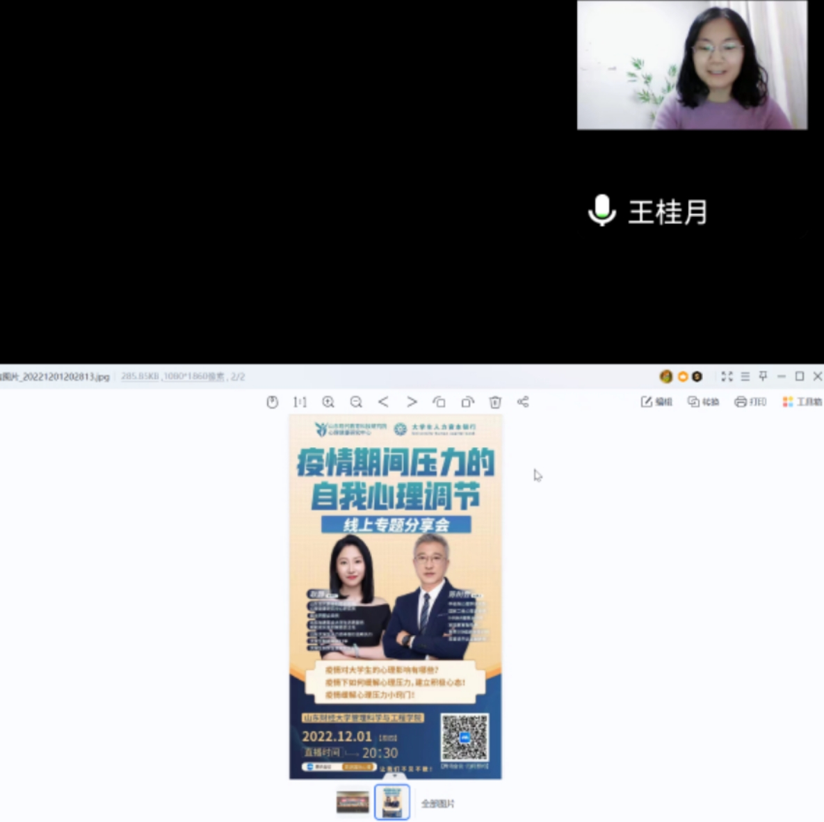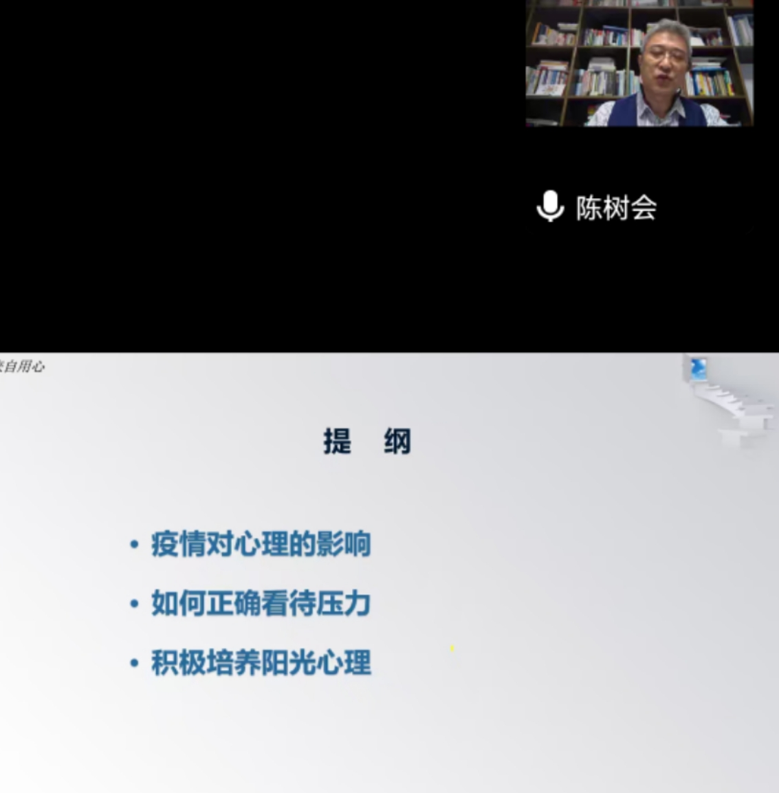 在当前疫情形势下,为让公司师生能以更加阳光积极的心态来应对疫情压力,继11月24日组织员工收看心理健康讲座之《我的幸福我做主》后,12月1日晚,公司再次开展心理健康讲座活动,本次讲座的主题是《疫情期间压力的自我心理调节》,邀请的主讲人是国家二级心理咨询师、家庭教育指导师、世界500强资深培训师陈树会先生,山东现代教育科技研究院心理健康研究中心研究员耿静女士担任嘉宾,讲座由学工办主任王桂月主持,师生通过腾讯会议观看了讲座。