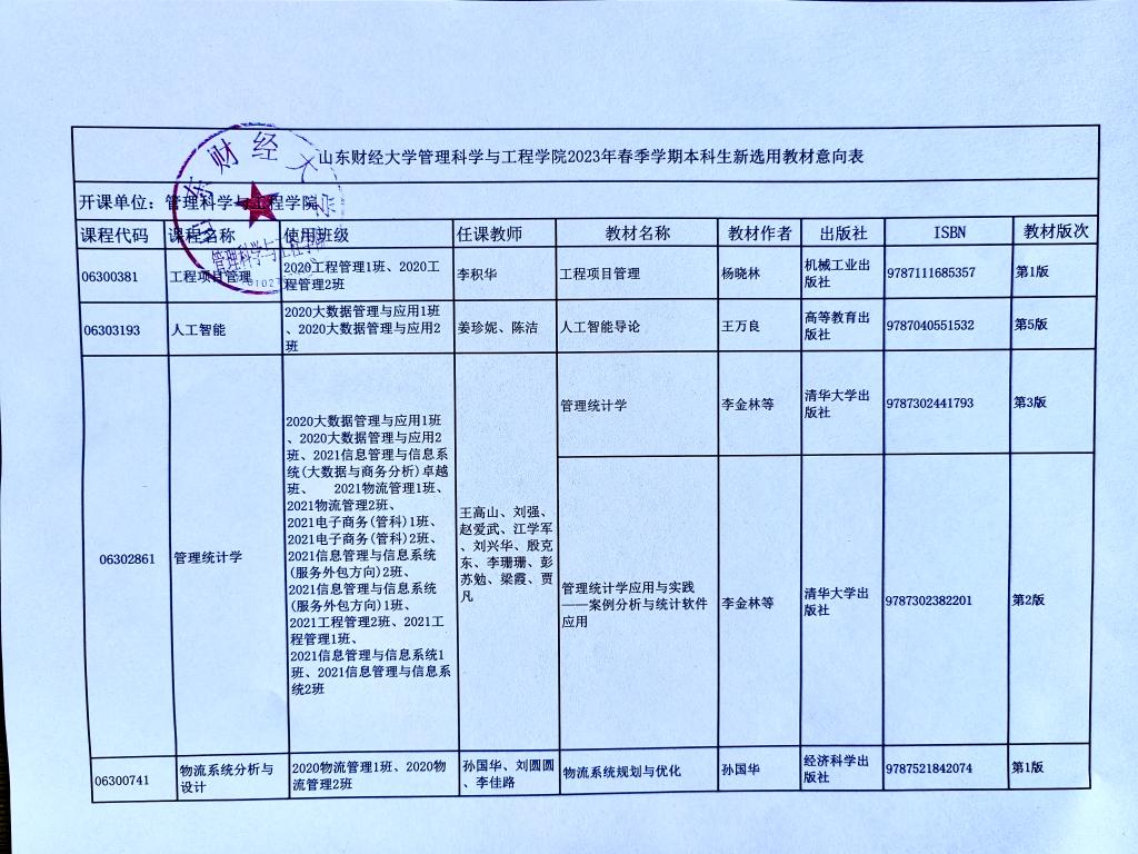 根据《英国上市公司365官网教材建设与选用管理办法(修订)》文件精神,管理科学与工程公司对2023年春季学期拟选用新教材进行公示,公示时间12月1日-12月3日。公示期间如有异议,请发送电子邮件至406@sdufe.edu.cn。